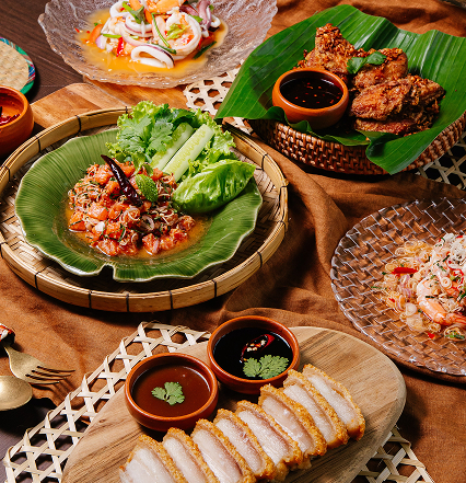 Open-air Thai home in the sky. Welcome drink, pinto sets from 590, ya dong herbal infusions, and Thai draft beers.